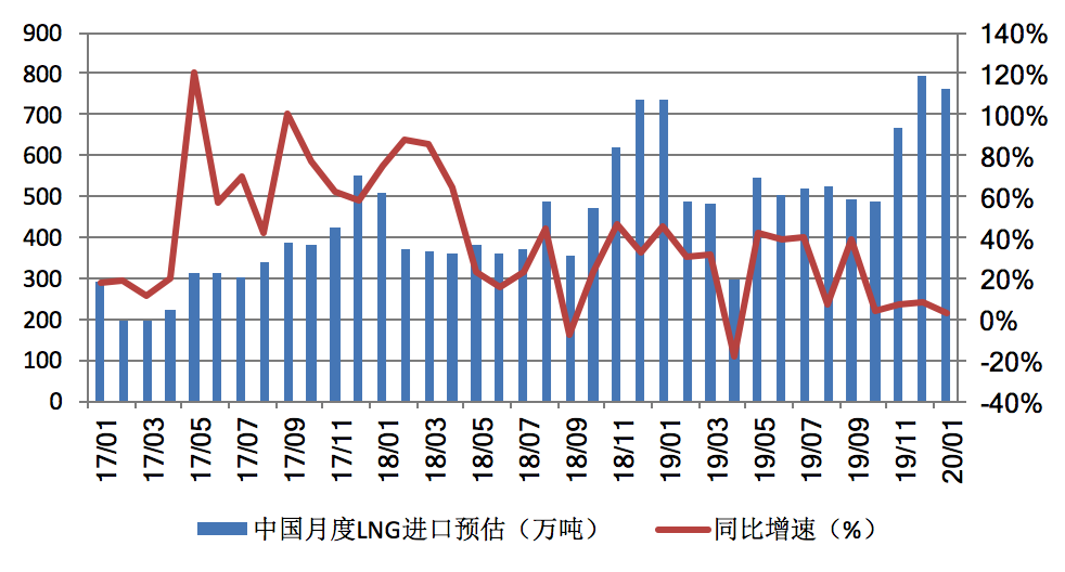 新華能源E-gas數(shù)據(jù)平臺的預測結果顯示,2020年1月份,中國LNG進口量預計為763萬噸,較去年同期增長3.4%,較2019年12月減少3.9%。