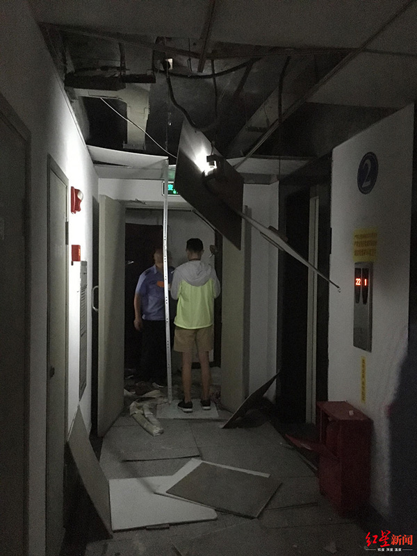 小區(qū)住戶屋內(nèi)爆炸,事發(fā)前保安曾兩次上門(mén)提醒有燃?xì)庑孤?本文圖片均來(lái)自紅星新聞業(yè)主們紛紛跑出門(mén),發(fā)現(xiàn)該住宅樓二樓的過(guò)道上,天花板垮了一地,門(mén)板、玻璃倒落在地上,二樓一住戶家中門(mén)開(kāi)著,爆炸聲由此傳出?!耙晃蛔艉鸵晃槐0彩芰藗R上打120送去了醫(yī)院?!币晃蛔舴Q。