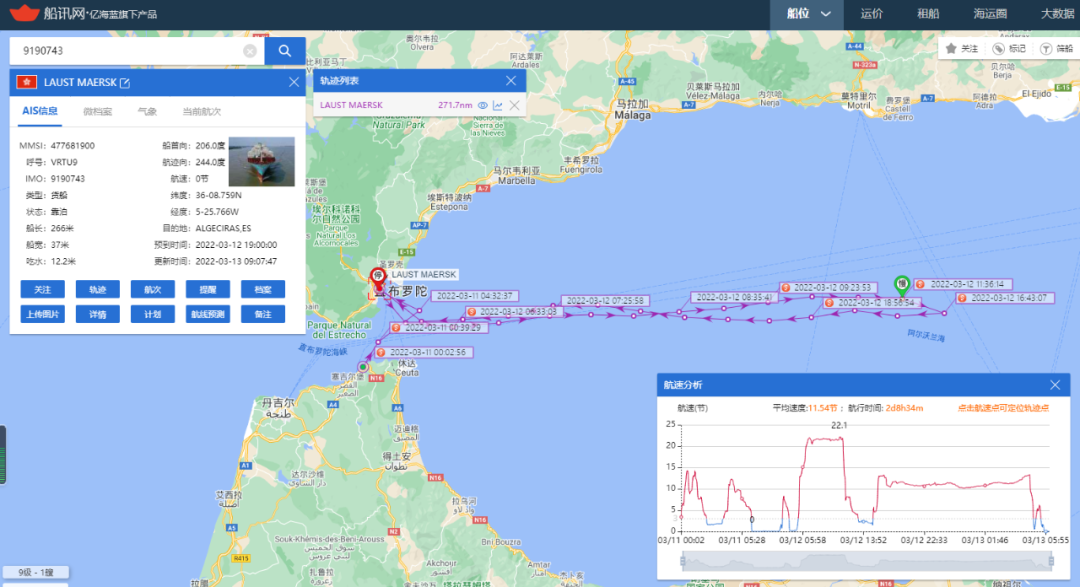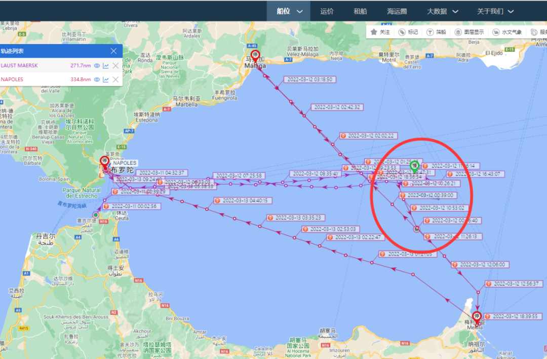 本航次,LAUST MAERSK輪正從巴拿馬經(jīng)丹吉爾和阿爾赫西拉斯到意大利的途中,而渡輪NAPOLES 是正從馬拉加前往西班牙領(lǐng)土摩洛哥梅利利亞的途中。
