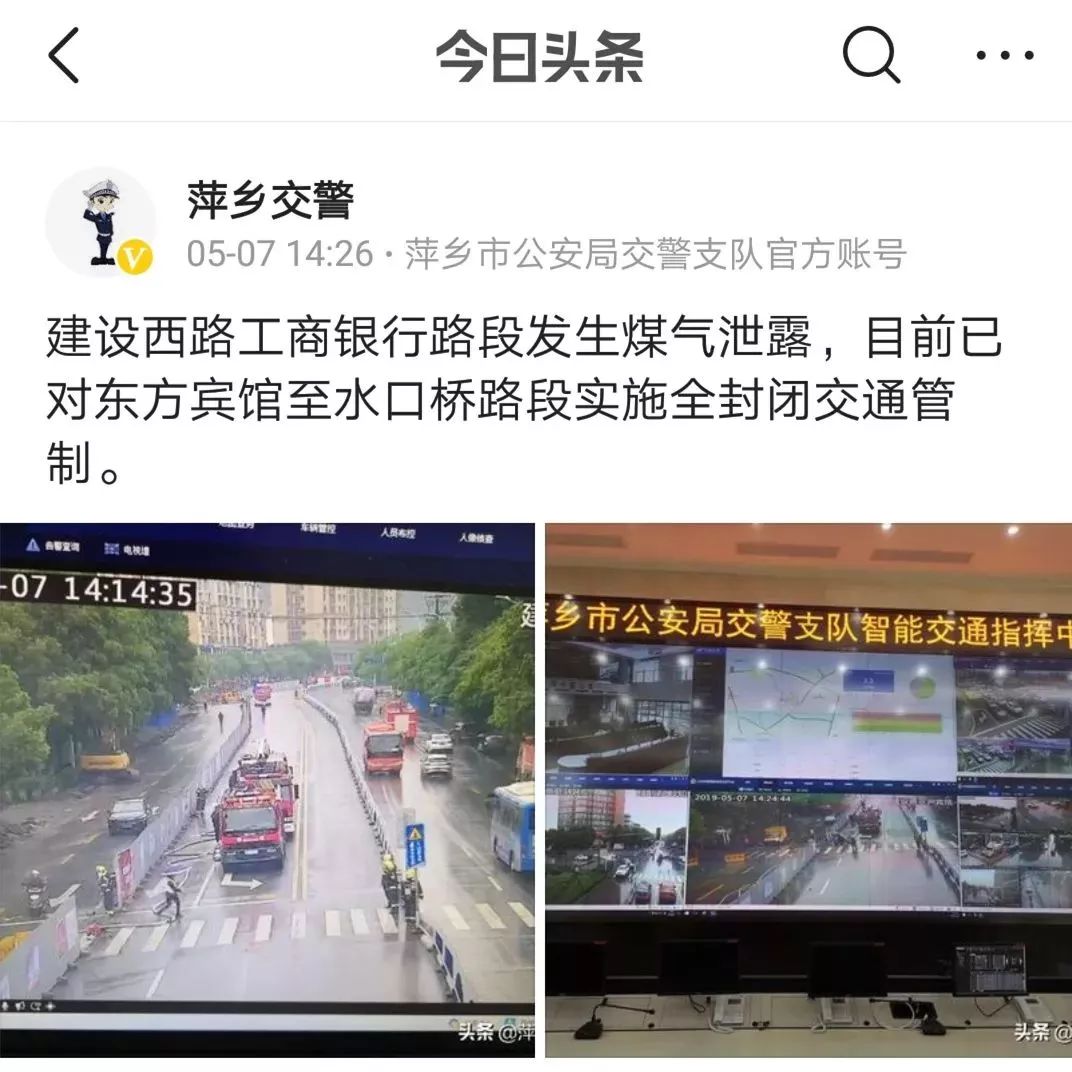 5月7日下午14時(shí)09分,萍鄉(xiāng)交警支隊(duì)指揮中心接到消防支隊(duì)119電話,在建設(shè)西路工商銀行路段發(fā)生天然氣泄漏事件,請求交警增援并實(shí)施路面交通管控。