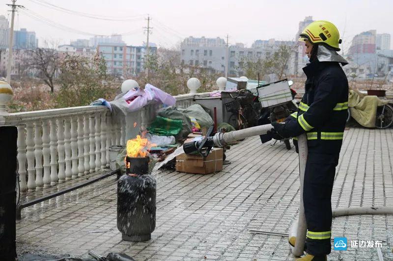 當(dāng)天上午8點28分, 延吉市消防大隊特勤中隊接到報警:延吉市園丁新村10號樓附近,一煤氣罐發(fā)生氣體泄漏,由于操作不當(dāng),瞬間燃起大火,情況緊急。