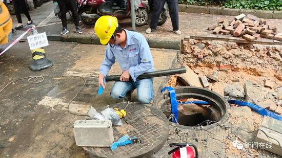 為了防止爆炸,消防部門在現(xiàn)場(chǎng)處置時(shí)使用了大量的水,而這些水積滿了現(xiàn)場(chǎng)開挖的土溝,于是,施工方準(zhǔn)備利用窨井進(jìn)行排水,看到這種情況,現(xiàn)場(chǎng)搶修人員趕緊喊停。